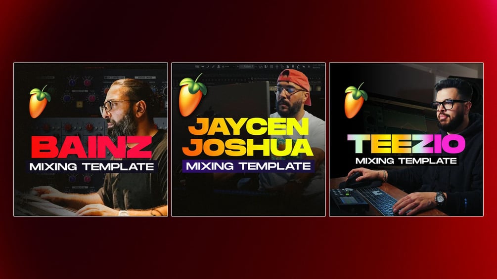 You will get 3 professional FL Studio mixing templates — Bainz, Teezio, and Jaycen Joshua — designed for hip-hop/rap but versatile for any genre, all at 10% off in one bundle.